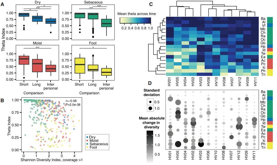 详情本研究利用宏基因组手段,对12位健康人,3个不同取样时间点,17皮肤部位进行了研究。结果显示尽管不同皮肤部位的理化性质不同,但是细菌整体随时间变化较稳定。足部皮肤的微生物群落可变性最高。瞬时物种主要是真核生物的病毒。不同部位的皮肤微生物群落研究为疾病状态提供了新的提示。