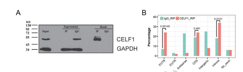 图3. CELF1结合基因的验证,以及结合基因的功能分析。(A)使用RIP-PCR来验证CELF1结合的基因。(B)CELF1结合基因的功能聚类分析。