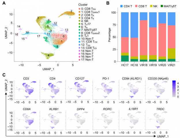 该文章基于单细胞技术解析了HIV感染者和健康对照外周血T细胞转录组图谱,发现HIV感染者外周血MAIT细胞共刺激分子和干扰素诱导基因显著上调。