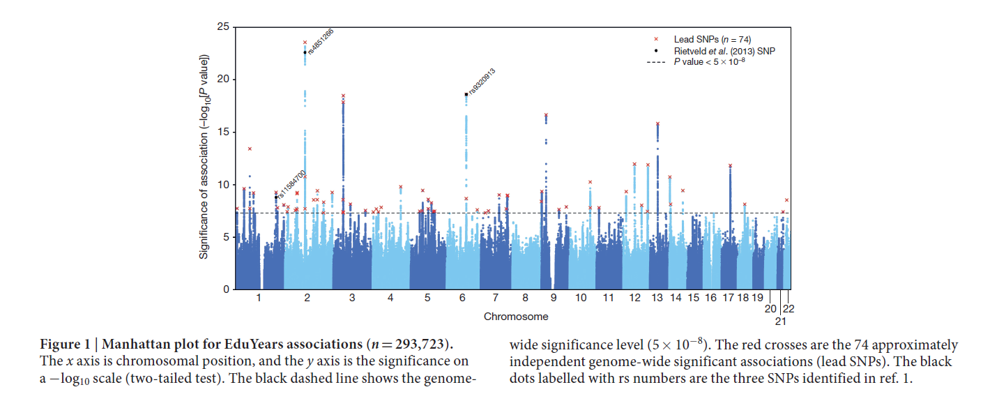 Okbay A, Beauchamp JP, Fontana MA, et al. 2016. Genome-wide association study identifies 74 loci associated with educational attainment. Nature, doi:10.1038/nature17671.