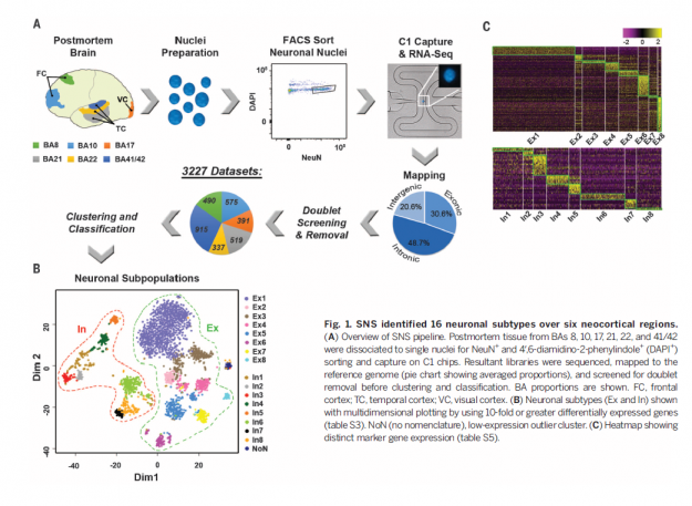 对单个人类大脑神经元细胞核进行单细胞核转录组测序能够高效鉴定人类大脑神经性元不同亚型,奠定“绘制”人类脑神经元细胞基因活性方法的基础。同时,可以帮助我们更好理解人脑正常功能及疾病异常,包括阿尔茨海默氏症、帕金森症、精神分裂症和抑郁症等。