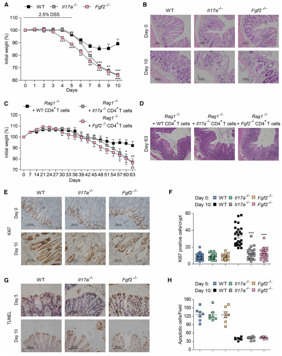 肠道微生物在营养吸收和人体免疫系统的发展过程中起到根本作用,而且肠道微生物与宿主间的共生关系在维持肠道内稳态中至关重要。肠道上皮受损后如果无法适当的修复将导致菌群结构失调,进而引发炎症反应,并最终引发炎性肠道疾病(IBD)或结直肠癌(CRC)。然而,对于肠道上皮损伤后如何修复重建肠道内稳态,以避免失调导致的疾病,我们仍然知之甚少。因此,本文旨在阐明菌群驱动的生长因子FGF2与白介素IL-17是如何协作促进修复受损的肠道上皮屏障的。