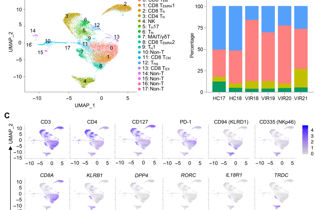 该文章基于单细胞技术解析了HIV感染者和健康对照外周血T细胞转录组图谱,发现HIV感染者外周血MAIT细胞共刺激分子和干扰素诱导基因显著上调。